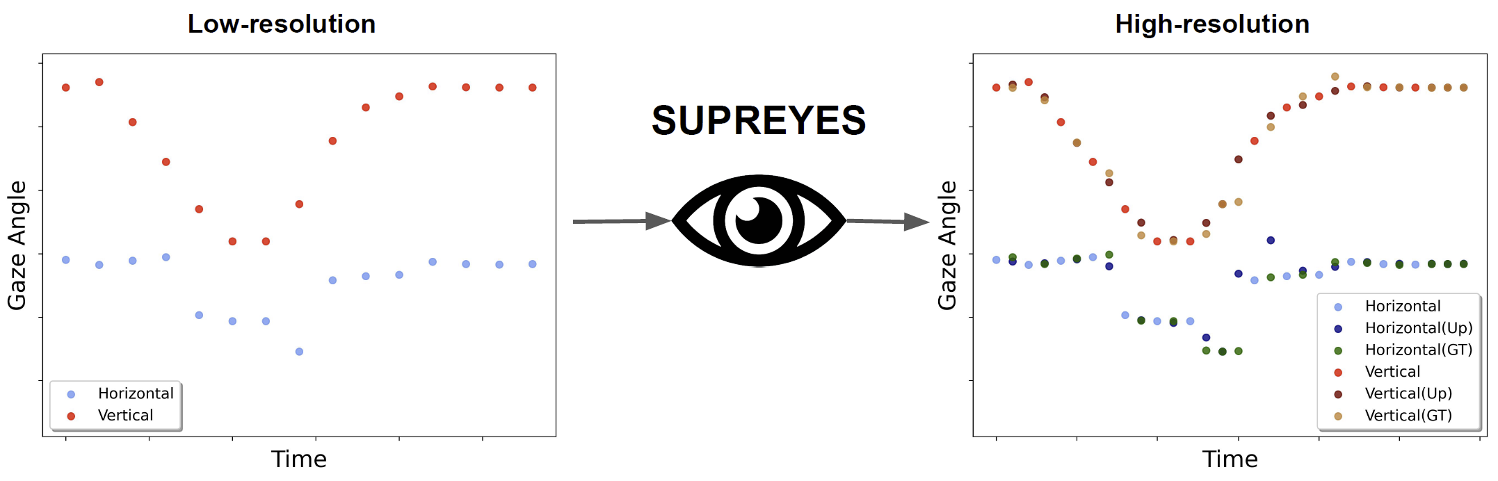 We introduce SUPREYES – a novel self-supervised method to increase the spatio-temporal resolution of gaze data recorded using low(er)-resolution eye trackers. Despite continuing advances in eye tracking technology, the vast majority of current eye trackers – particularly mobile ones and those integrated into mobile devices – suffer from low-resolution gaze data, thus fundamentally limiting their practical usefulness. SUPREYES learns a continuous implicit neural representation from low-resolution gaze data to up-sample the gaze data to arbitrary resolutions. We compare our method with commonly used interpolation methods on arbitrary scale super-resolution and demonstrate that SUPREYES outperforms these baselines by a significant margin. We also test on the sample downstream task of gaze-based user identification and show that our method improves the performance of original low-resolution gaze data and outperforms other baselines. These results are promising as they open up a new direction for increasing eye tracking fidelity as well as enabling new gaze-based applications without the need for new eye tracking equipment.